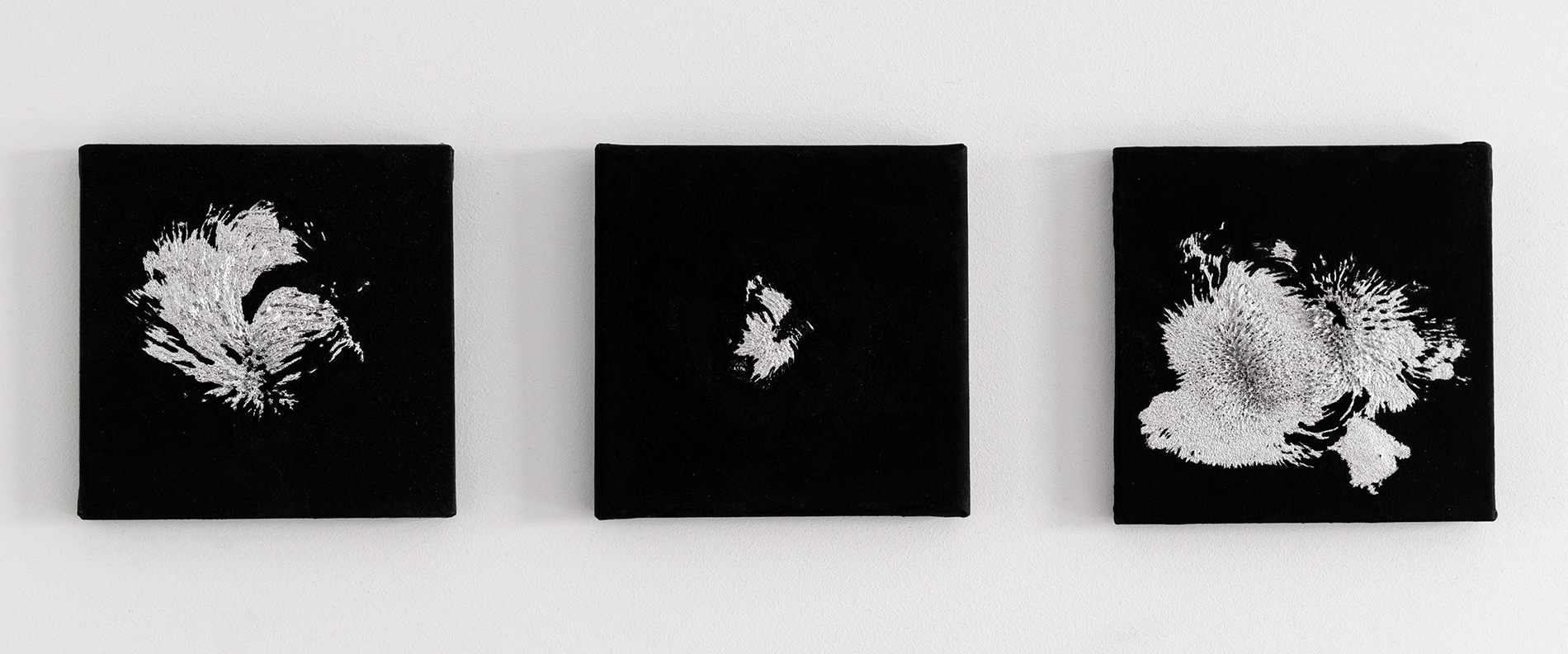 Tesla 3.1, Tesla 3.2, Tesla 3.3, 2021, mixed media with iron on canvas, 20x20 cm each